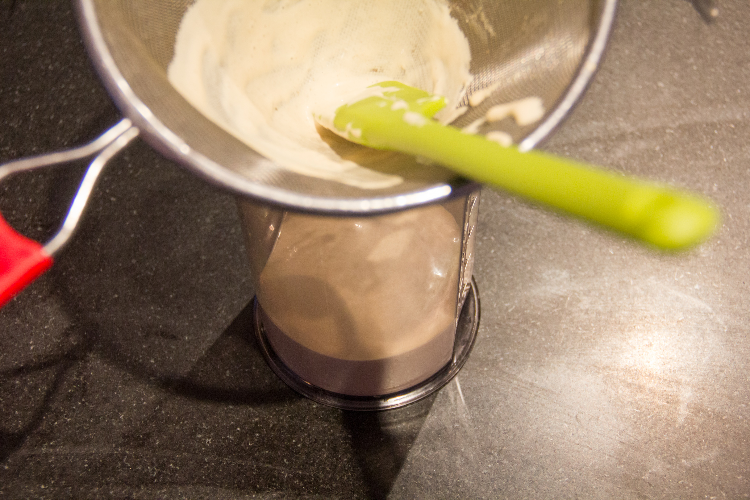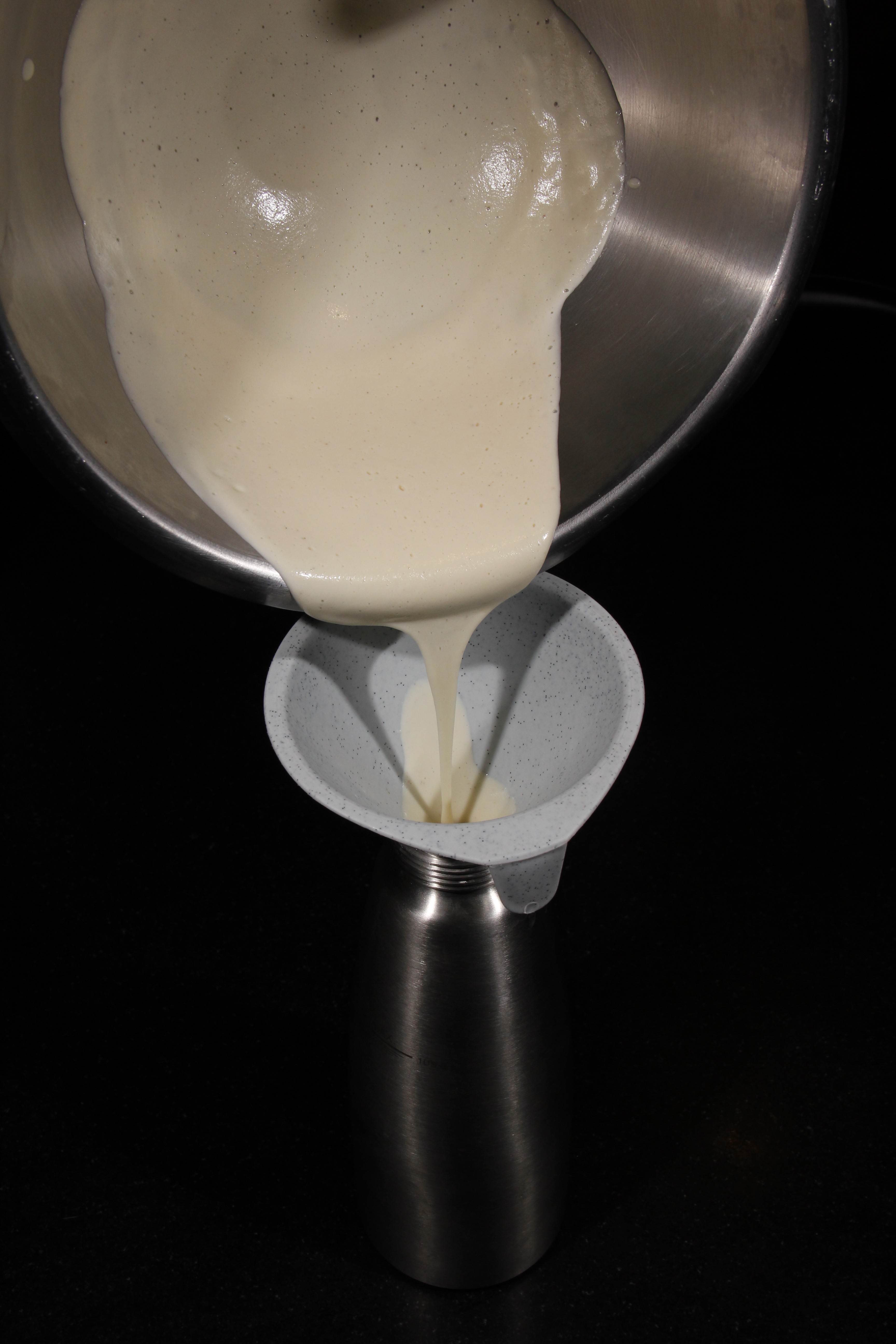 - Filtrez cette préparation au travers d’un tamis pour éviter qu’un petit morceau de poivre, d’ail ou de noix de muscade ne bouche votre siphon…