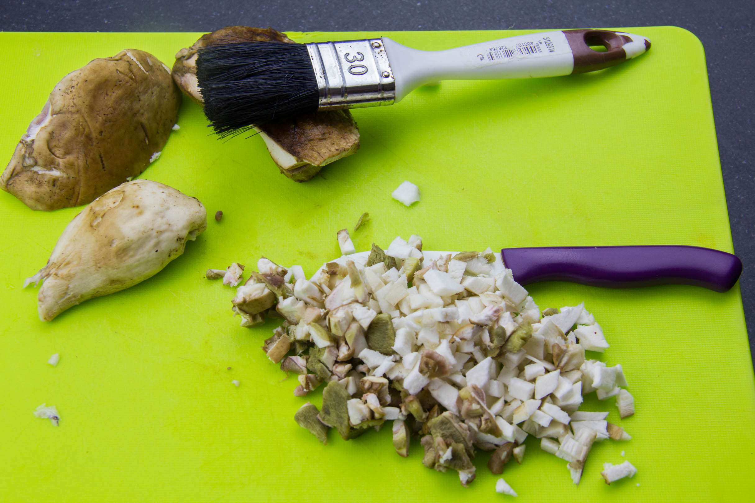 - Nettoyez les cèpes avec un pinceau; réservez-en quelques uns et coupez les autres en fine brunoise.