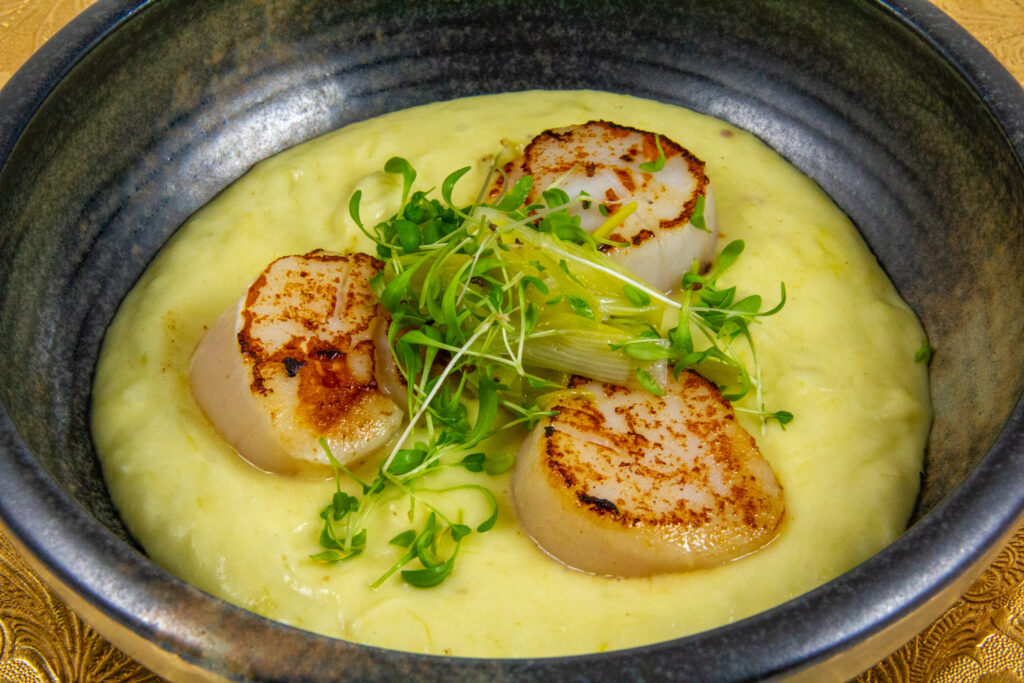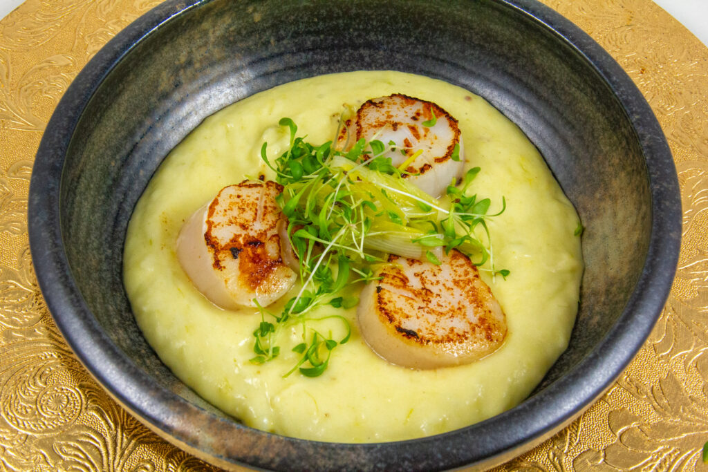 - Versez la crème de poireaux et pommes de terre dans les assiettes; placez les Saint Jacques par dessus ainsi qu’un peu de poireaux assaisonnés au milieu. Saupoudrez de pousses de cresson.