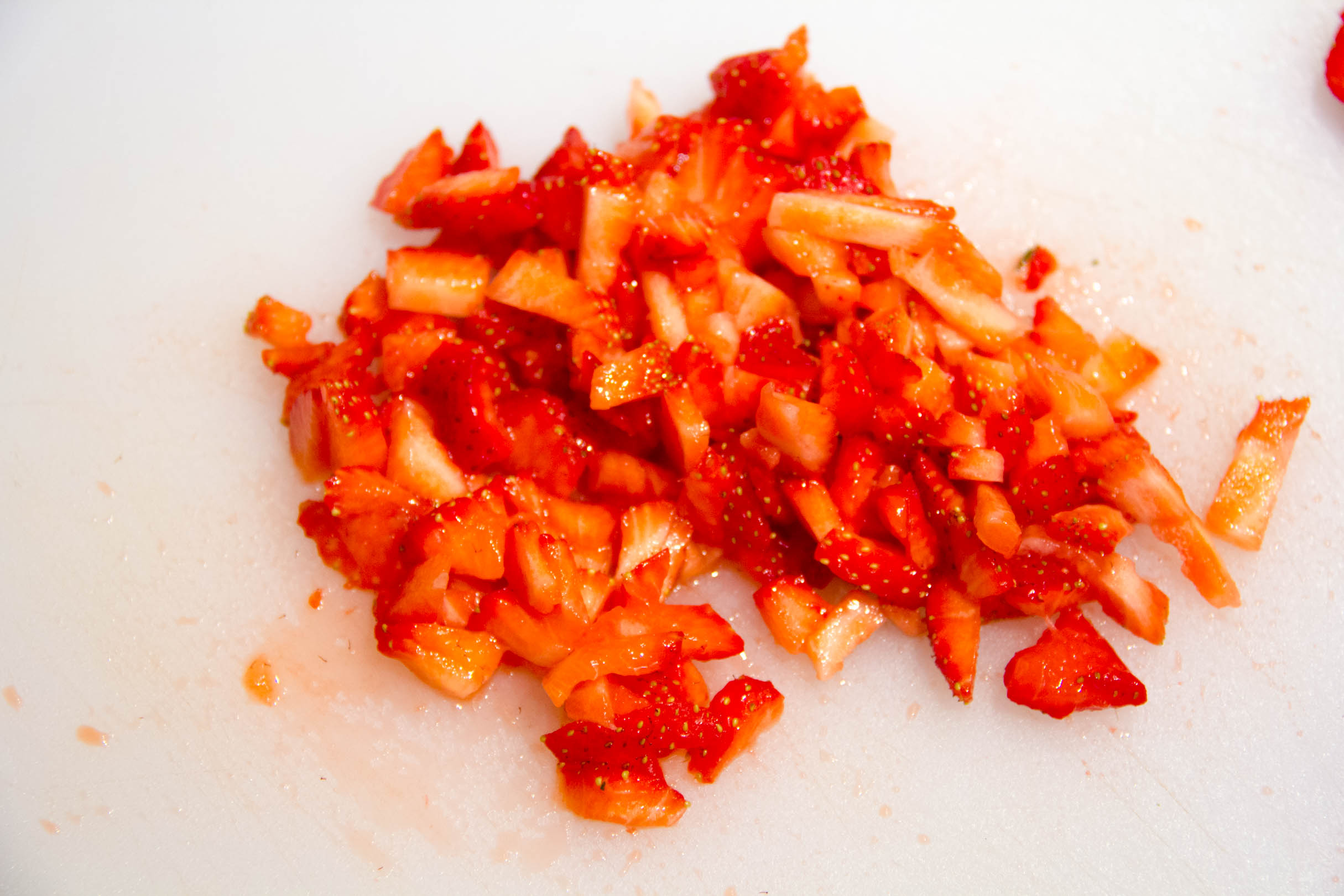 - Coupez les fraises que vous avez réservées en petite brunoise et citronnez légèrement le tout. Réservez.