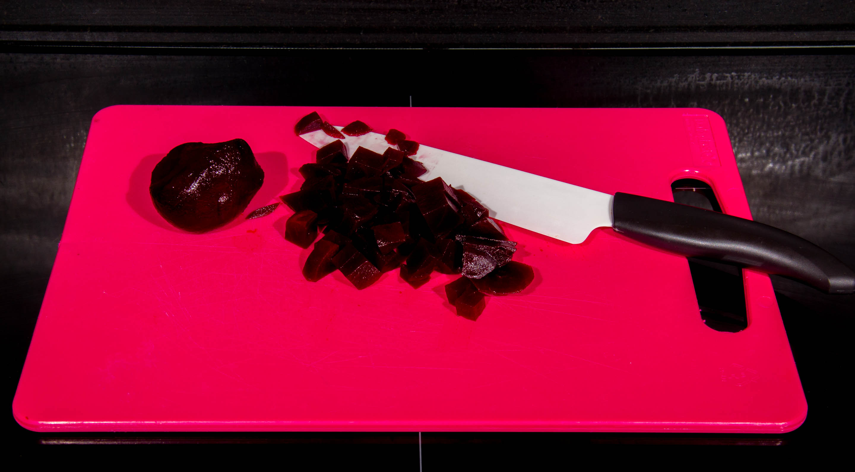 - Coupez les 100 g de betteraves restantes en petits dés. Chauffez-les au micro onde et mixez-les finement avec un trait d’huile d’olive citronnée; salez et poivrez.