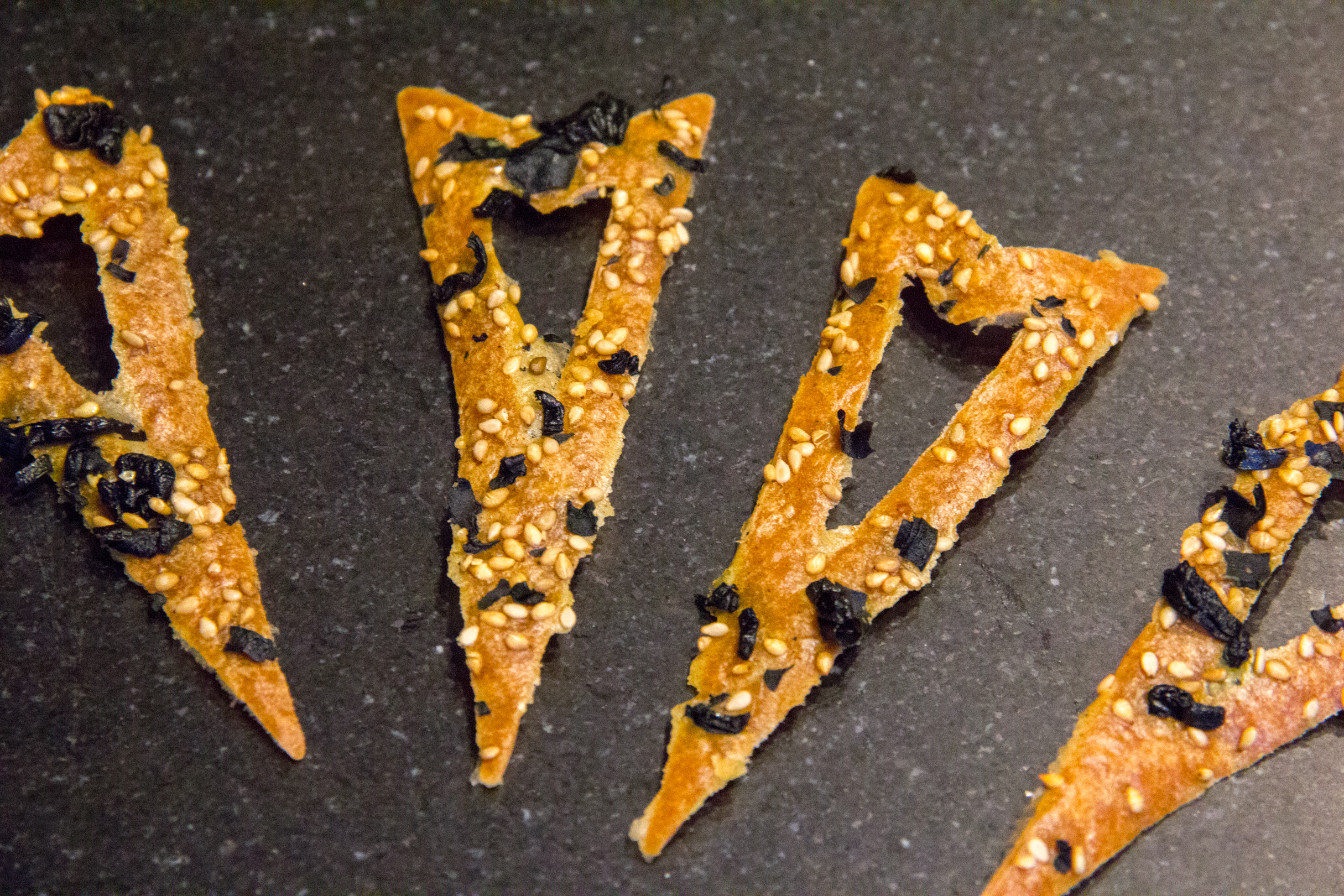 Pour les crackers: je vous en rappelle les ingrédients et vous trouverez la recette en cliquant ici. Ils sont très faciles à faire et ne nécessitent que 5 mn de préparation et 15 mn de cuisson…Ils apportent une touche très gourmande au plat et une superbe note iodée. Ils se conservent plusieurs jours dans une boîte hermétique.