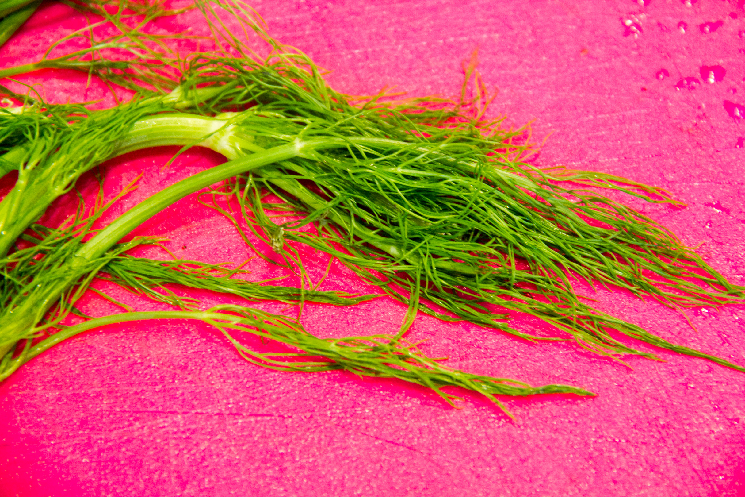 • On commence par le fenouil. N’oubliez pas de garder de côté les « pluches » c’est à dire les petites feuilles très fines du fenouil. Elles serviront également pour le dressage.