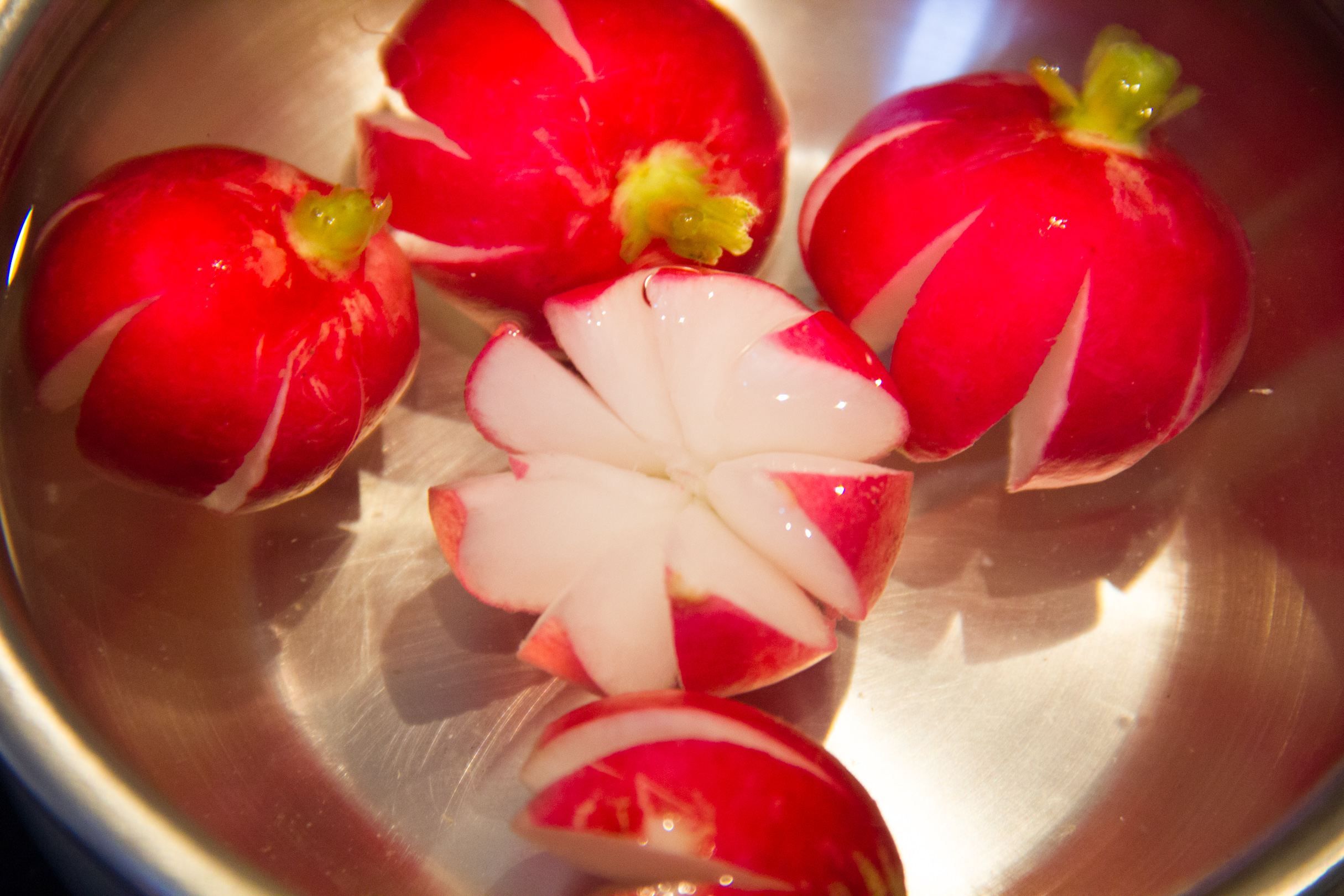Coupez les quatre derniers radis en étoile et plongez-les dans une coupelle d’eau