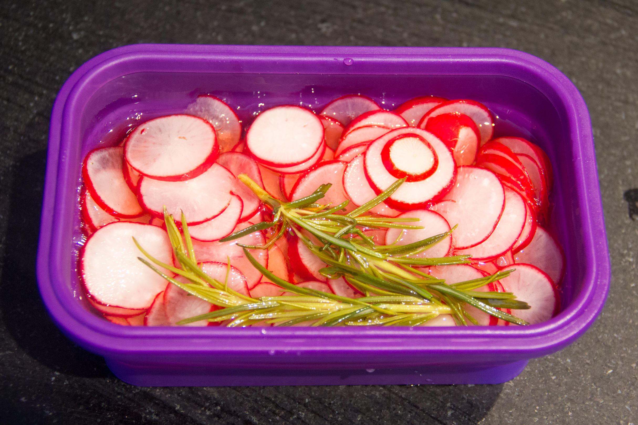 • Faites chauffer le vinaigre, le sucre, la branche de romarin; à ébullition versez le tout sur les radis émincés et disposés dans une boîte que vous allez fermer hermétiquement. Réservez. Ces pickles se conservent plusieurs jours au frigo: vous pouvez les déguster également avec de la viande froide, du foie gras…