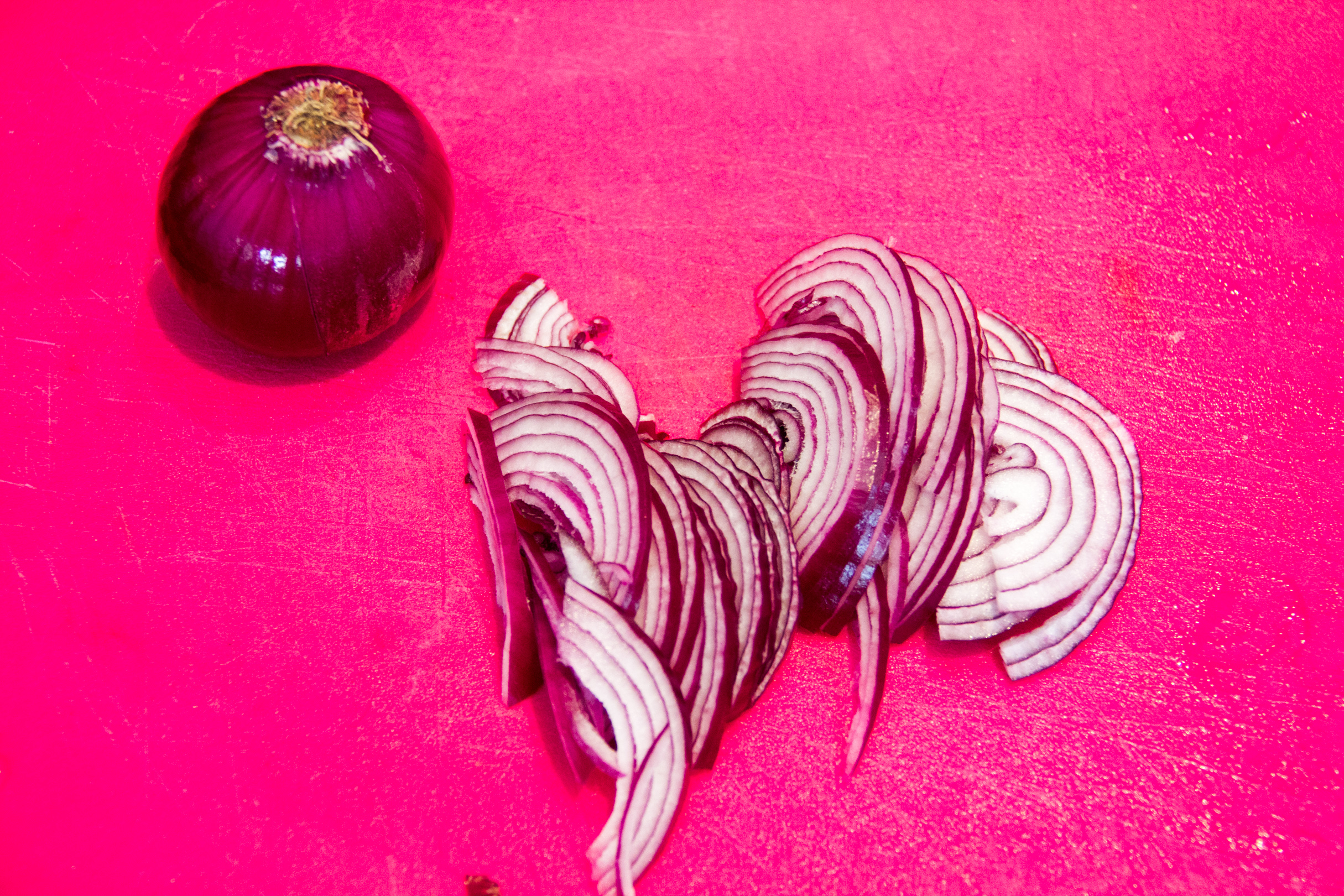 • Coupez également les oignons rouges en fines lamelles.