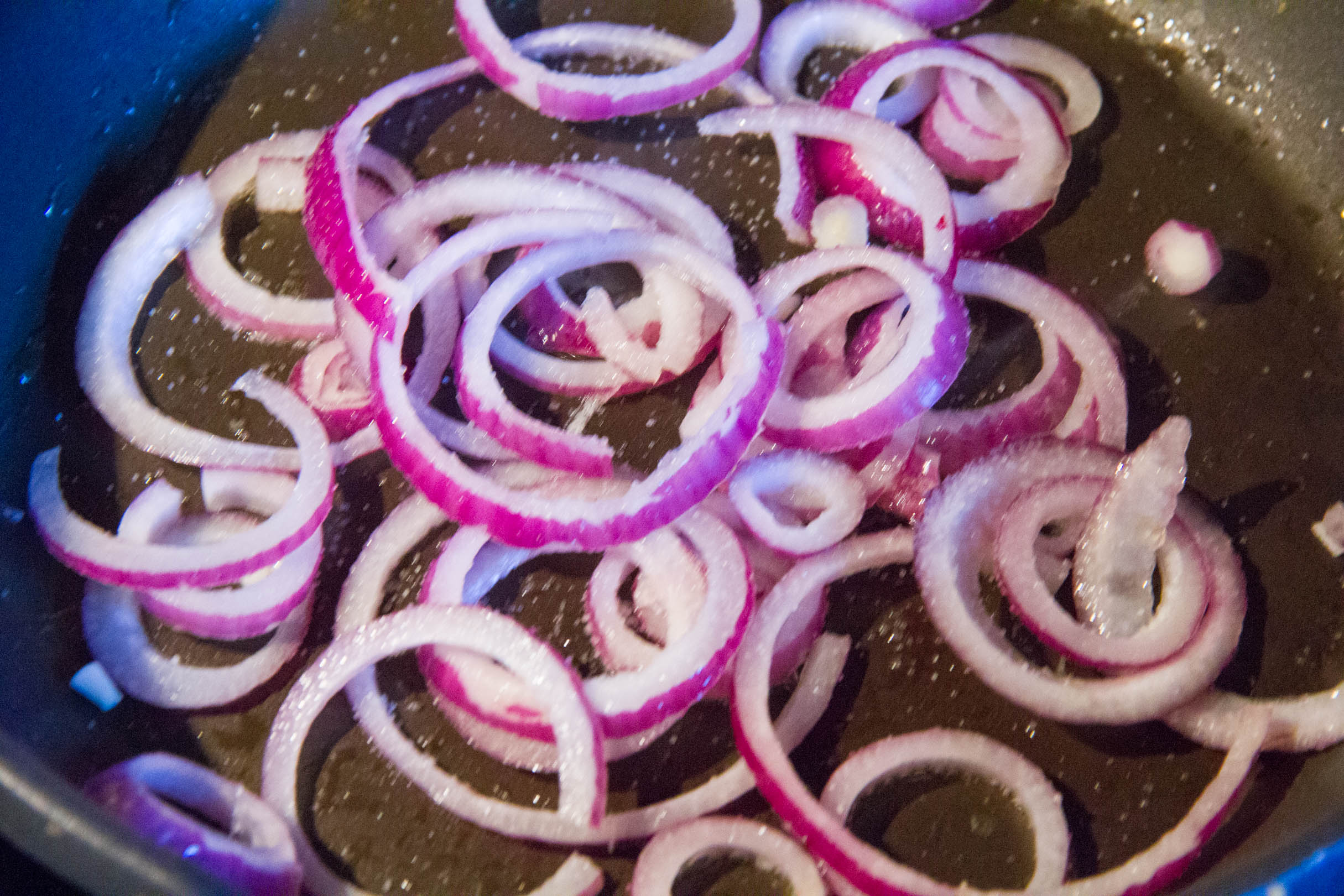Faites revenir doucement les tranches d’oignon rouge dans la poêle