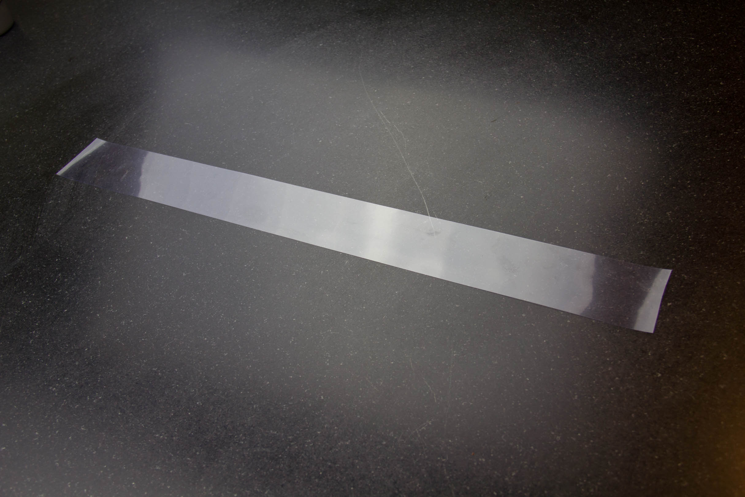 - Coupez une bande de rhodoïd de la longueur exacte de la circonférence de votre cercle. Déposez-la sur une grande bande de film alimentaire (cela vous évitera de salir votre plan de travail avec du chocolat).