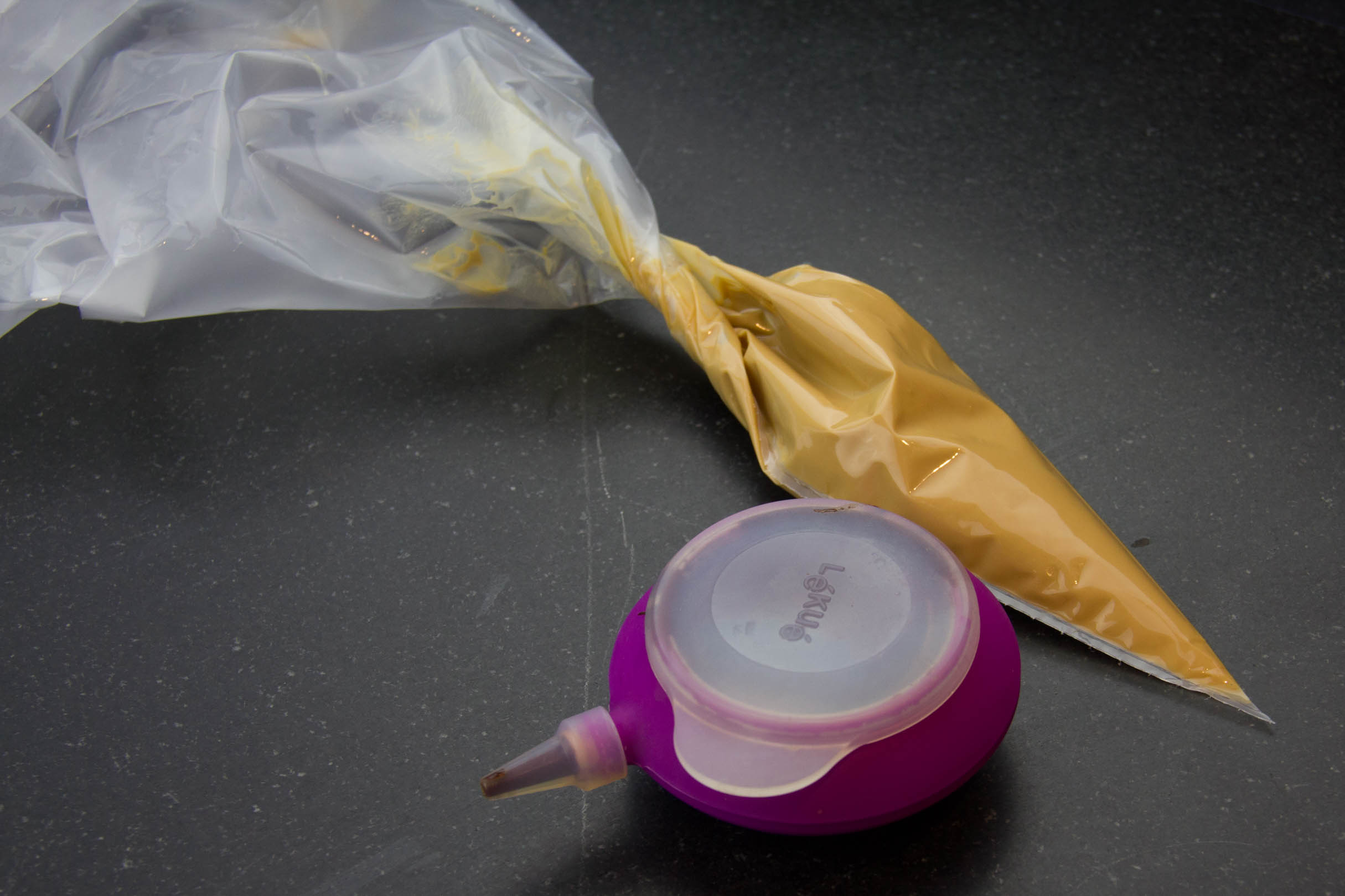 - Versez le chocolat fondu dans une petite poche à douille sans douille. Puis coupez l’extrémité de celle-ci à l’aide d’un ciseau: vous devez faire une petite entaille de manière à avoir un petit diamètre de 2 mm. Ou mieux utilisez ce petit ustensile rose très pratique de la marque Lekue.