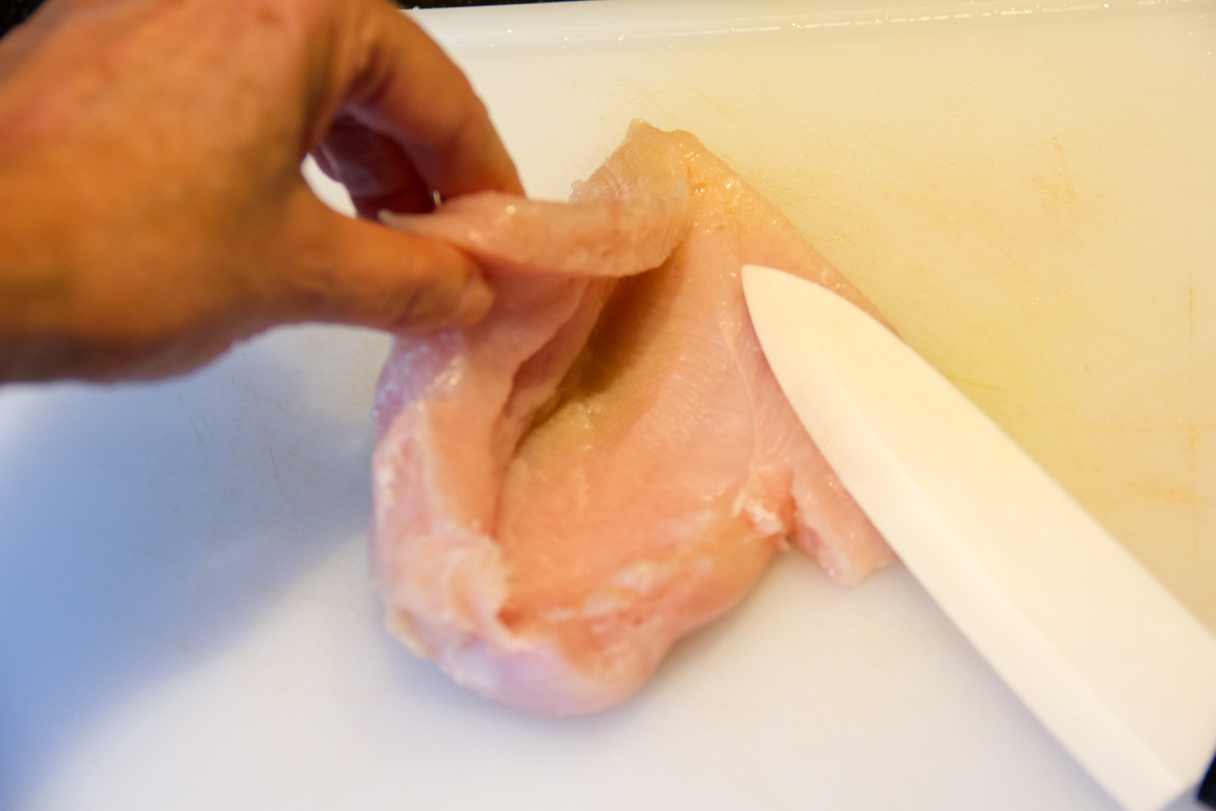 - Ouvrez vos blancs de poulet en portefeuille de manière à les amincir.