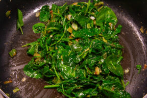 - Faites-les revenir dans une poêle avec une belle noix de beurre. Puis rajoutez les épinards et remuez très régulièrement. Les épinards cuisent assez vite donc attention de ne pas les cuire de trop. Salez et poivrez. Réservez.
