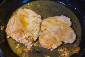 - Déglacez la poêle avec le vin blanc et le jus du 1/2 citron. Laissez réduire de moitié. Replacez les escalopes de poulet, côté non cuit dans la poêle avec 30 g de beurre en morceaux. Nappez régulièrement les escalopes avec la sauce juste le temps de finir de les cuire ( 2 minutes max). Servez immédiatement.