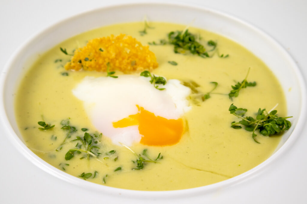 - Versez quelques gouttes d’huile d’olive sur le velouté et posez une chips de parmesan prés de l’œuf.