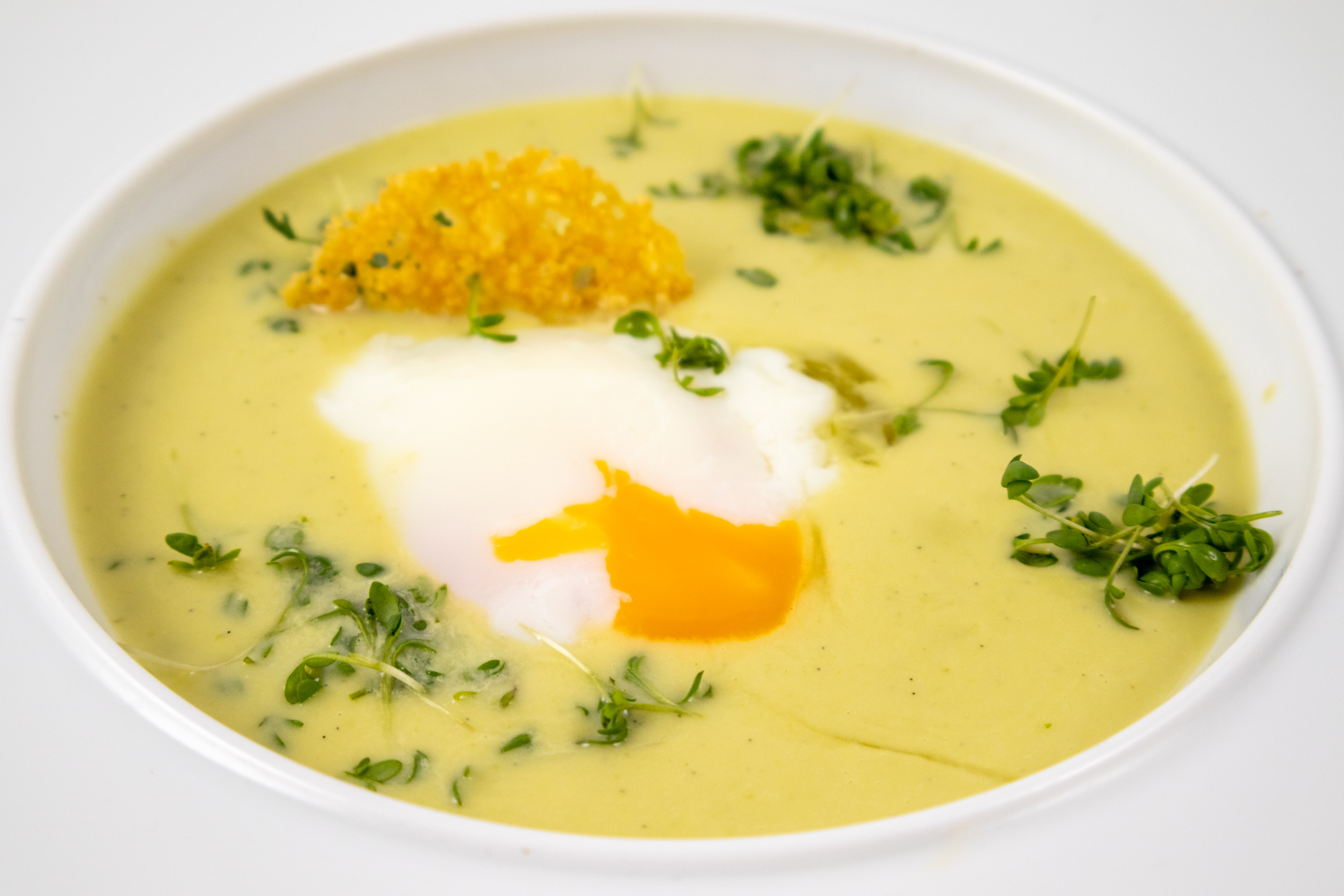 - Versez le velouté dans l’assiette. Cassez délicatement un œuf au milieu de l’assiette.